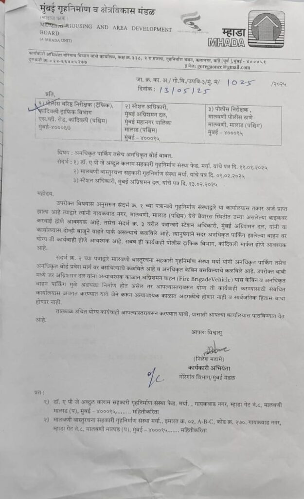 हमारी मीडिया टीम डिप्टी कमिश्नर ऑफ पुलिस (DCP) और असिस्टेंट कमिश्नर ऑफ पुलिस (ACP) से अनुरोध करती है कि इस गंभीर मुद्दे पर तत्काल ध्यान दें। अवैध पार्किंग के चक्कर में कुछ लोग आम नागरिकों की जान जोखिम में डाल रहे हैं। कृपया कार्रवाई में देरी न करें और हाथ पीछे न खींचें। साथ ही, सतीश राउत से सवाल पूछा जाए कि MHADA की शिकायत के बावजूद कार्रवाई न करने का क्या कारण है?