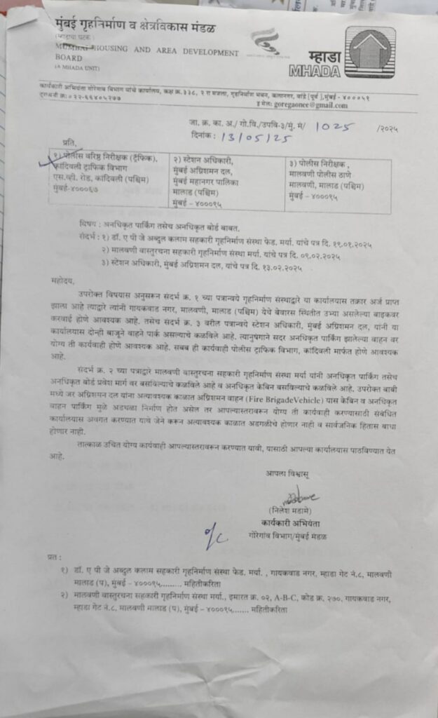 कांदिवली ट्रैफिक डिवीजन को म्हाडा द्वारा पत्र जारी, फिर मालवणी स्वप्नपूर्ति सोसायटी और डॉ ए पी जे अब्दुल कलाम संस्था के अध्यक्ष बालासाहेब भगत द्वारा सरकारी कार्य में बाधा क्यों डाला जा रहा है, एक तरफ बालासाहेब भगत म्हाडा अधिकारियों को यह कहते हैं कि वह सभी वाहन को बाहर करने लिए नोटिस लगा चुके हैं, और तरफ जब कांदिवली ट्रैफिक पुलिस को कार्य करने से रोकते हैं..?