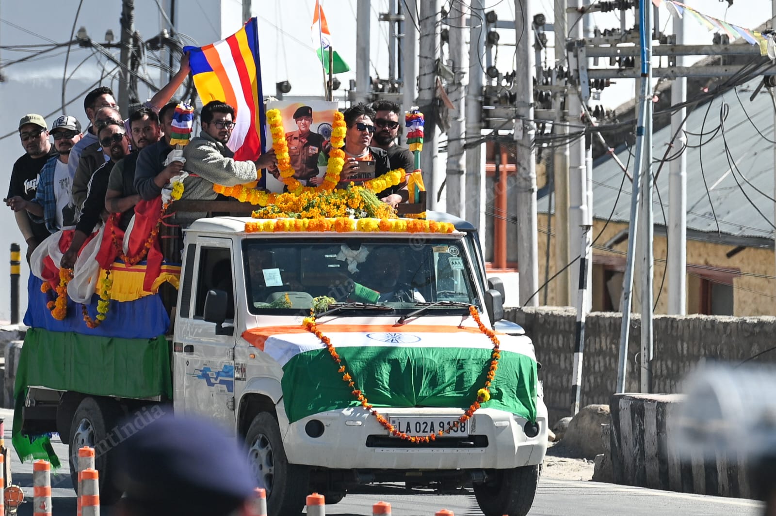 लीह, लद्दाख: 29 सितंबर 2025 को, कारगिल युद्ध के एक पूर्व सैनिक त्सेवांग थारचिन (46) के अंतिम संस्कार के दौरान लद्दाख के लीह में सुरक्षा व्यवस्था...